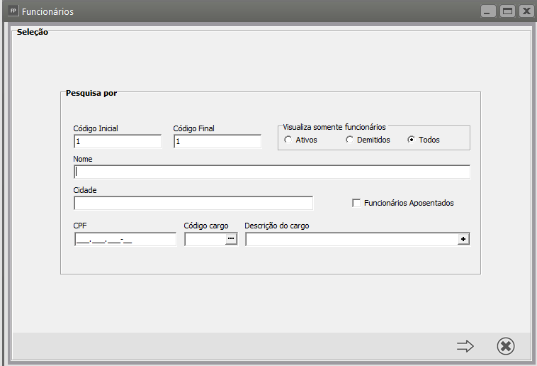 Correção Acesse o menu Manutenção > Manutenção de Funcionários > Manutenção, digite o Código do funcionário e clique na seta avança.