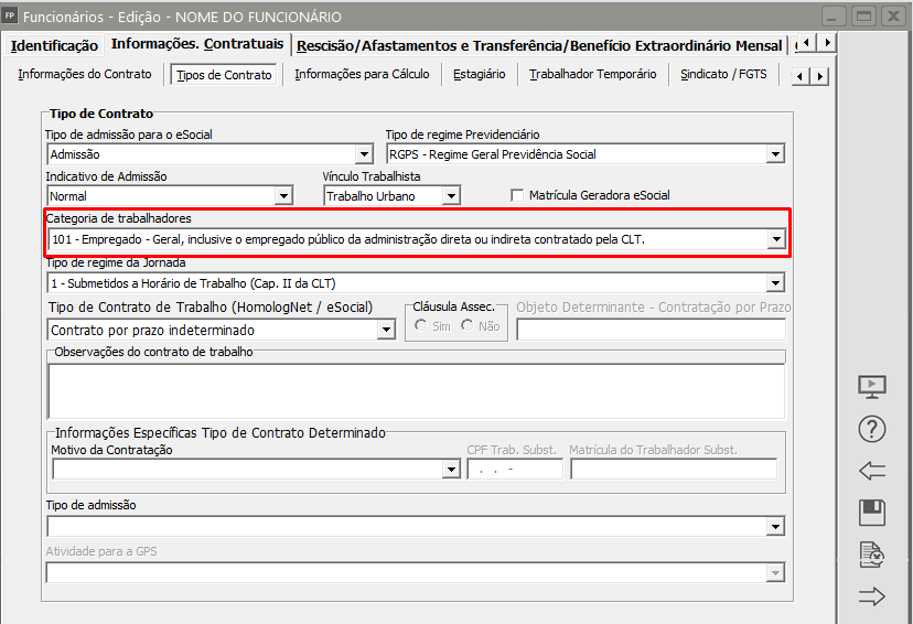 Edite o Cadastro do funcionário e acesse a aba Informações Contratuais > Tipos de Contrato , confira a informação da Categoria de trabalhador.
