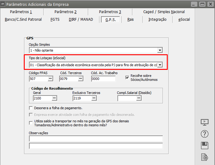 A categoria dos trabalhadores deve estar coerente com as informações do menu Manutenção > Empresas > Parâmetros Adicionais da Empresa - aba GPS