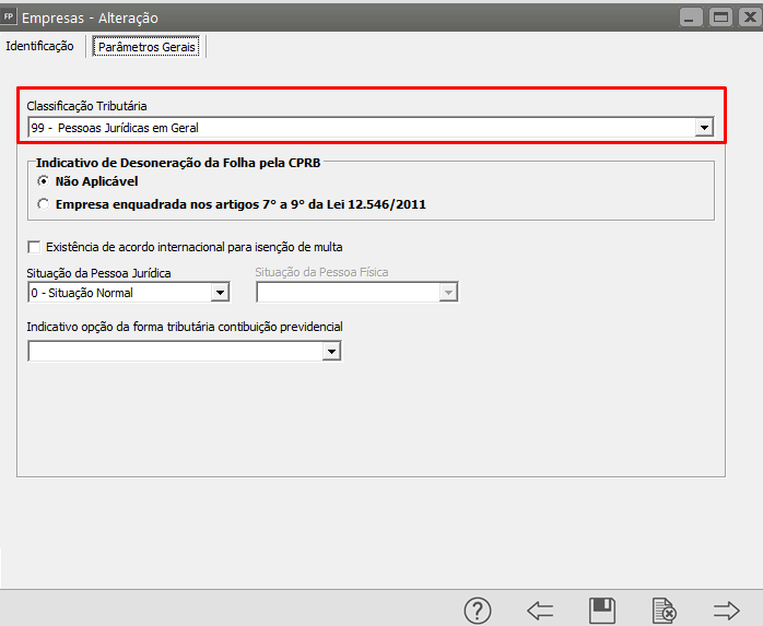 E também deve estar coerente com a informação do menu Manutenção > Empresa > Dados Cadastrais > Manutenção - aba Parâmetros Gerais - Campo Classificação Tributária.