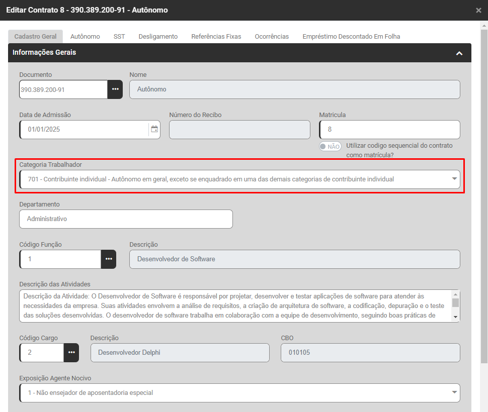 a) Verifique se o trabalhador é ou não um Contribuinte Individual e qual a categoria que foi informada para ele no portal do eSocial,