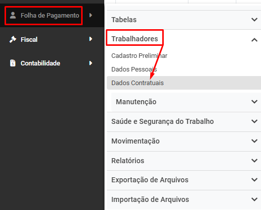 Correção: Acesse o menu Folha de Pagamento>Trabalhadores>Dados Contratuais e acesse a aba Cadastro Geral>Informações Gerais