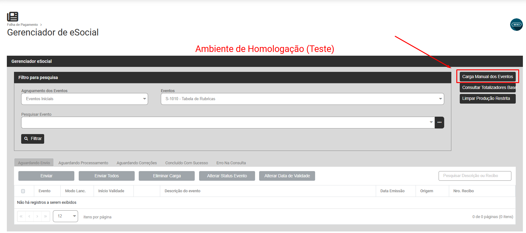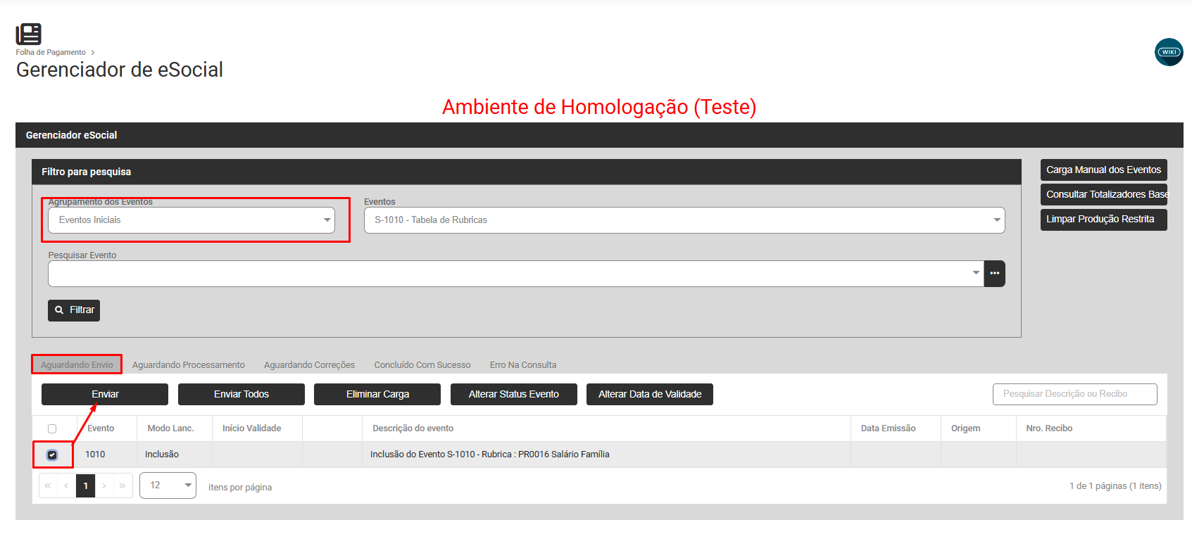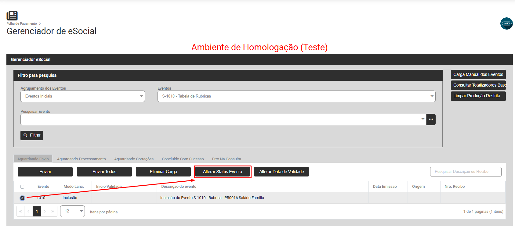 a) Caso o evento conste na relação e o status do mesmo seja Aguardando envio, faça o envio para o Portal do eSocial