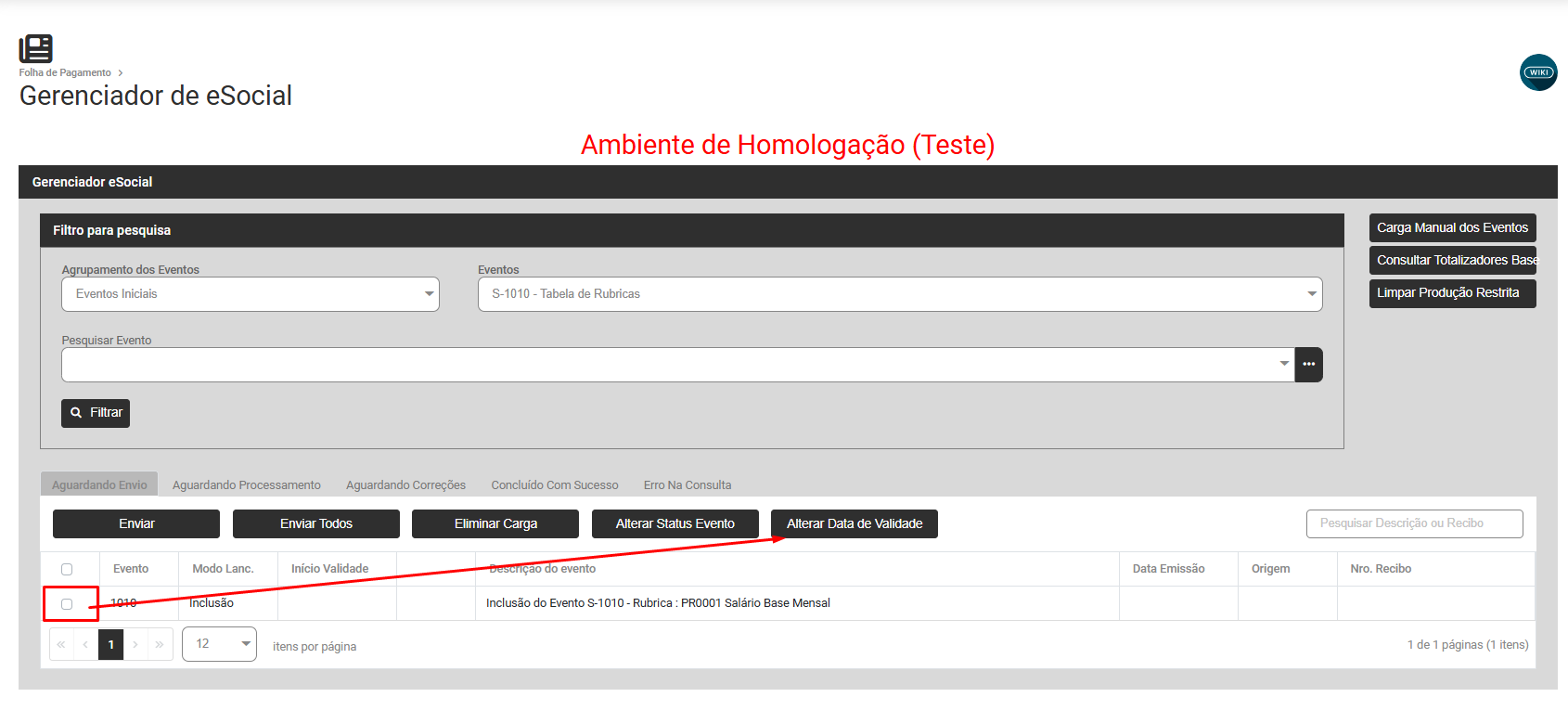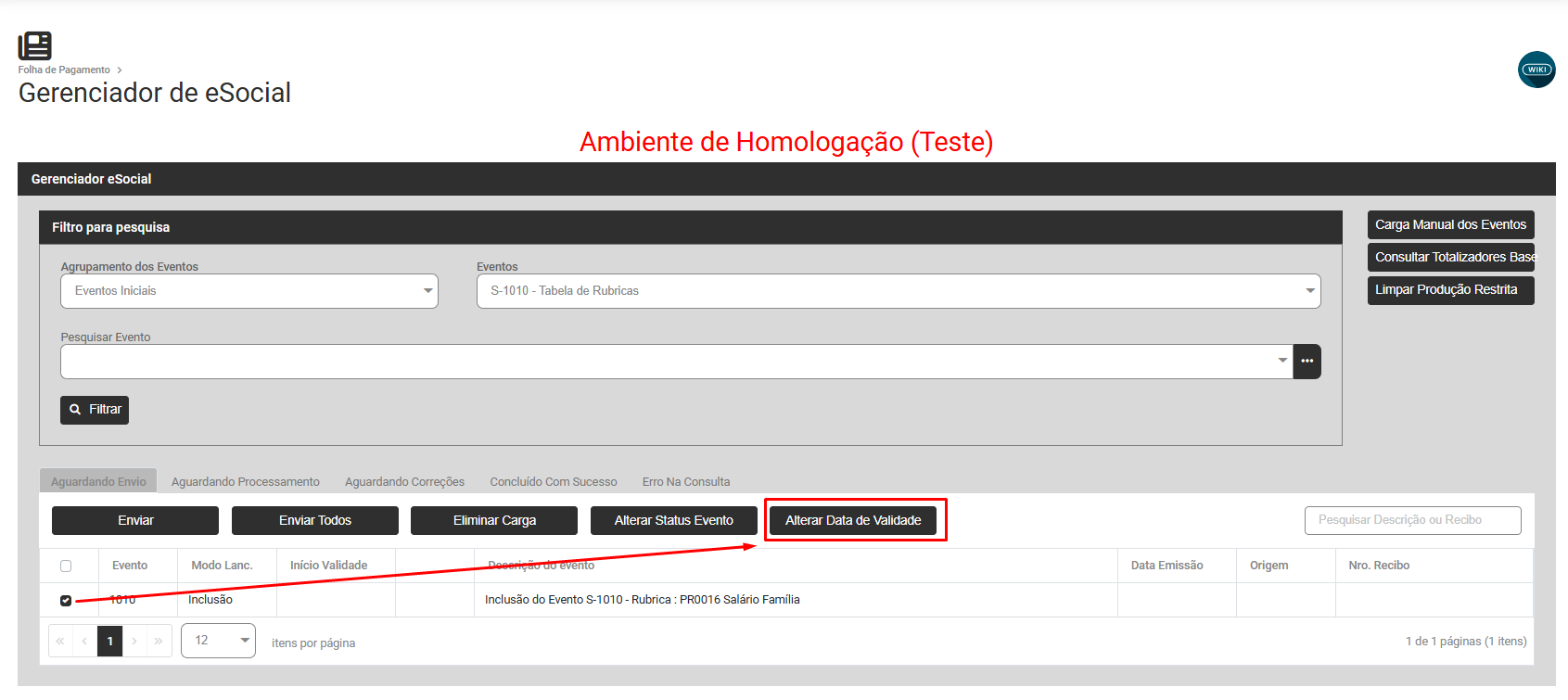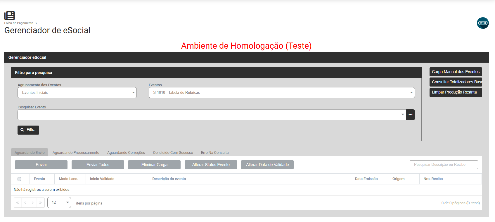a) Caso o evento conste na relação e o status do mesmo seja Aguardando envio, faça o envio para o Portal do eSocial