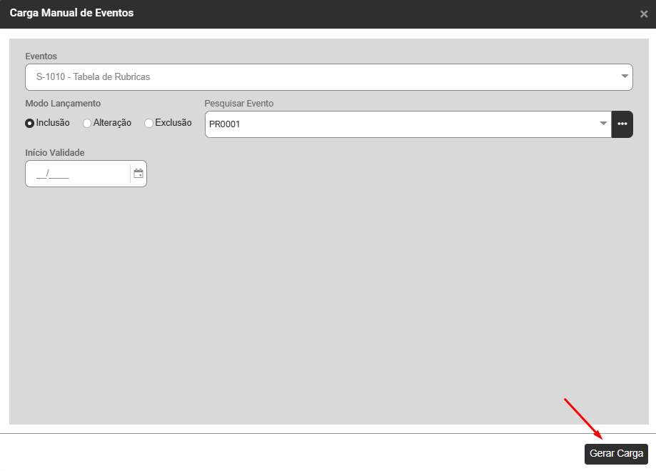 Pesquisar Evento - Defina o Evento que você precisa Gerar a Carga Manual