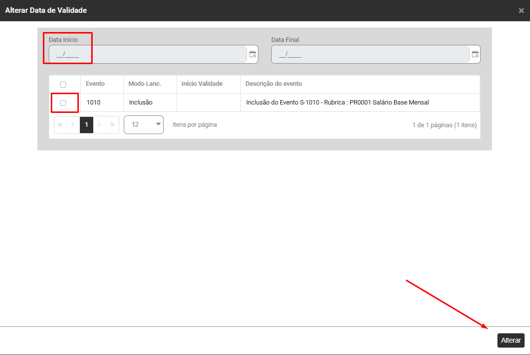 Informe a Nova data de Validade Inicial, selecione o evento e clique em Alterar