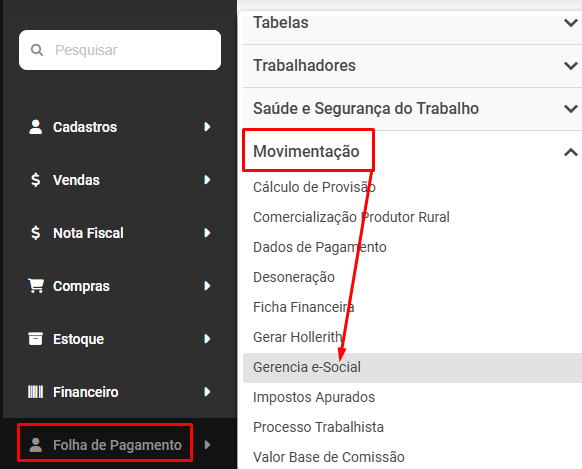 Correção: Acesse o menu Folha de Pagamento>Movimentação>Gerencia eSocial