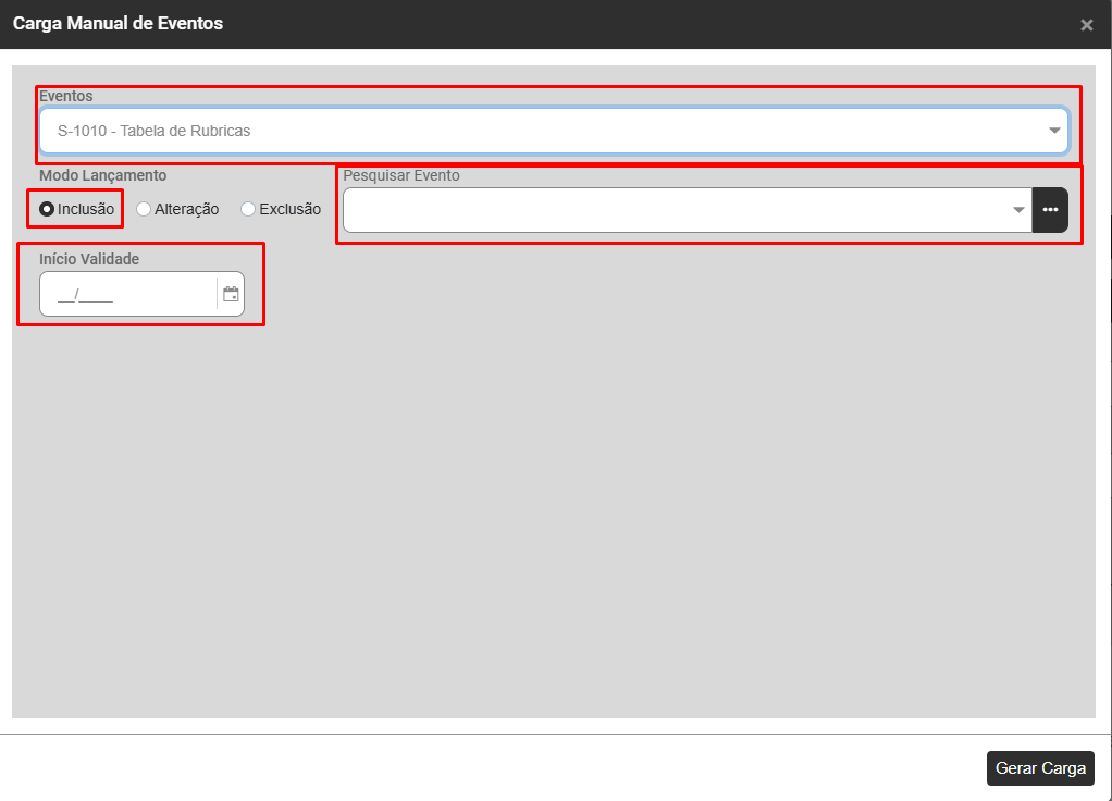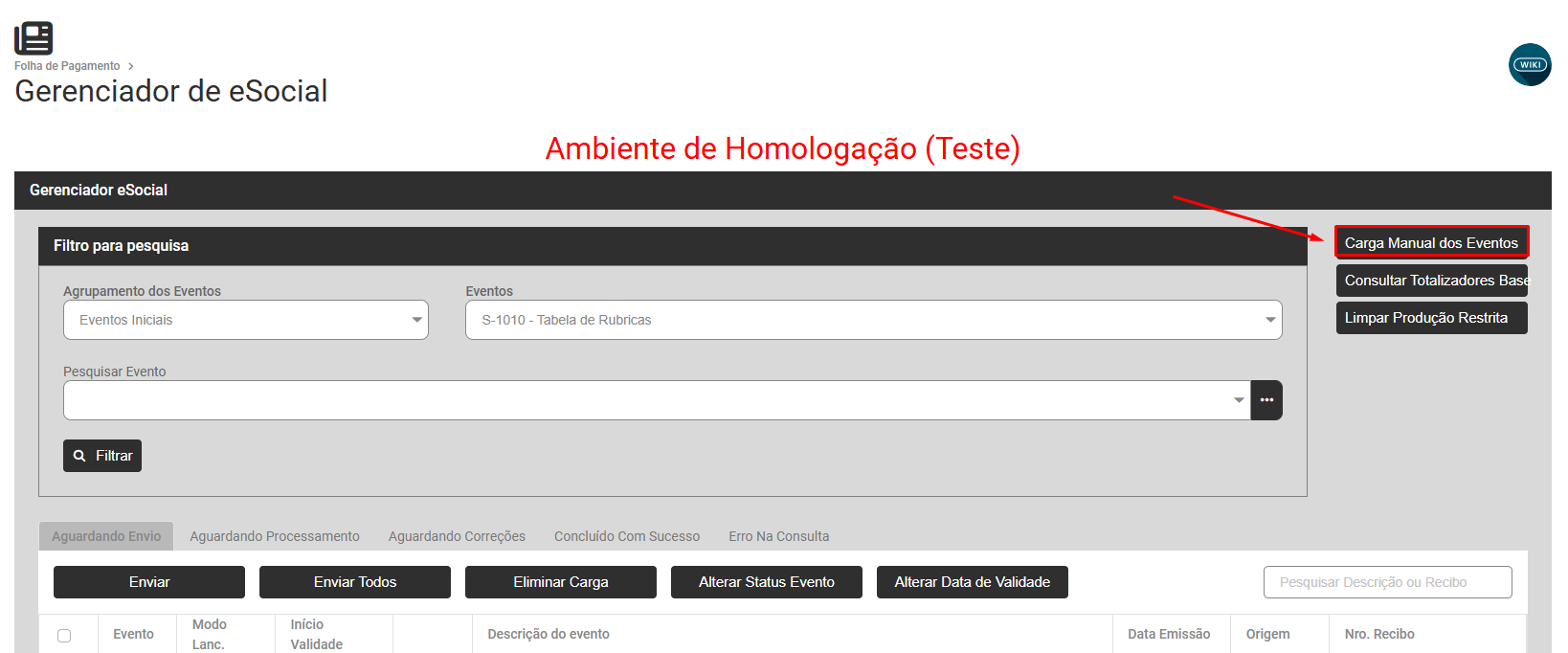 c) Caso Não conste no Gerenciamento de Transmissão do eSocial, acesse o botão Carga Manual dos Eventos