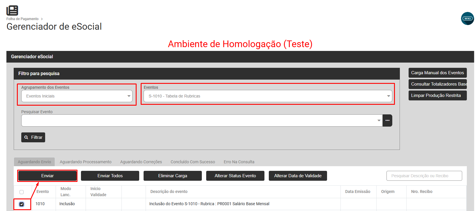 a) Caso o evento conste na relação e o status do mesmo Aguardando envio, faça o envio para o Portal do eSocial