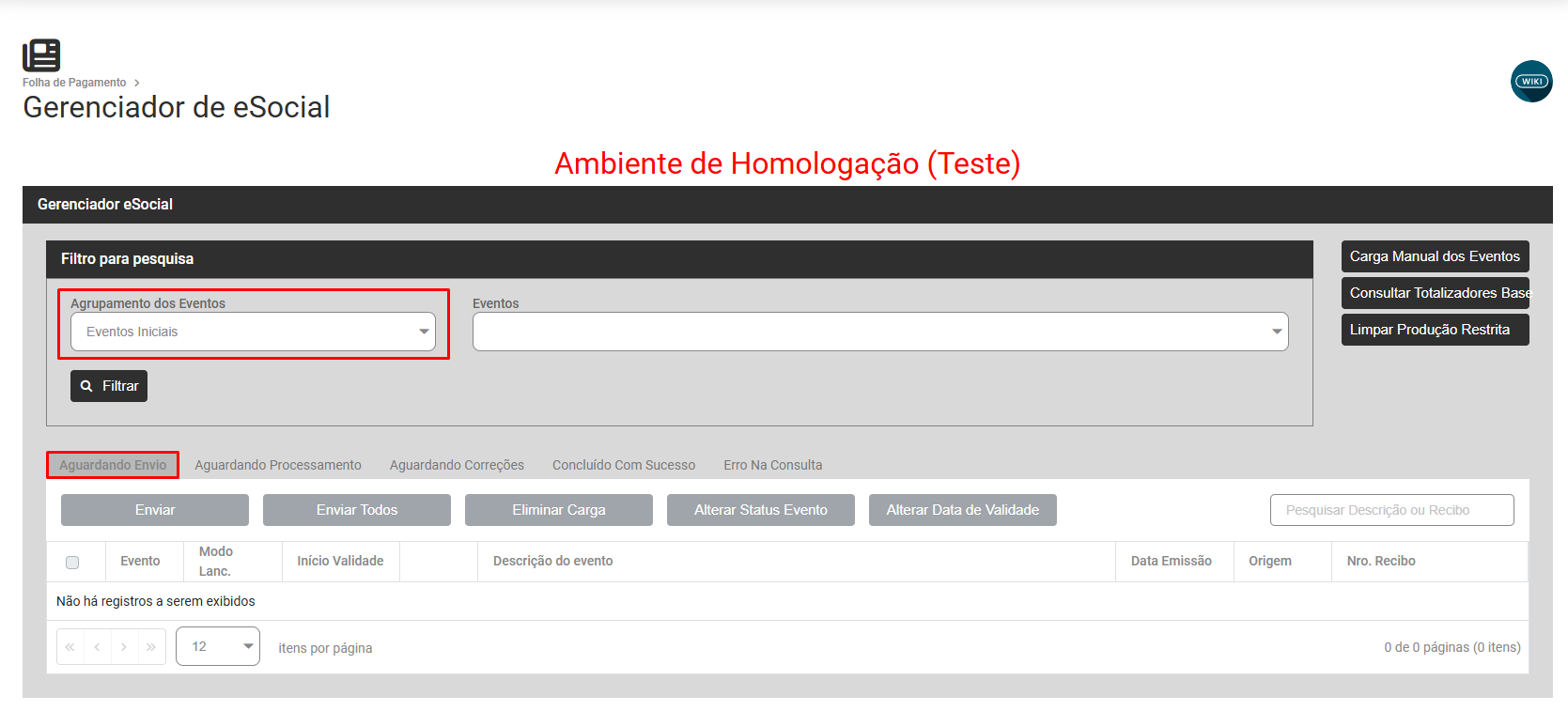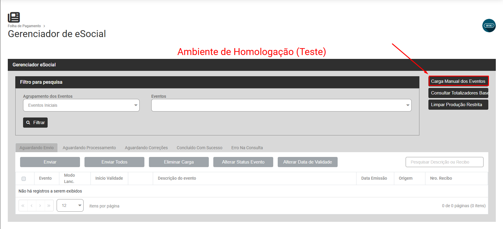 b) Caso a carga não conste no Gerenciamento de eSocial, clique em Carga Manual dos Eventos e gere a carga para o evento, em seguida faça o envio do mesmo pra o Portal do eSocial