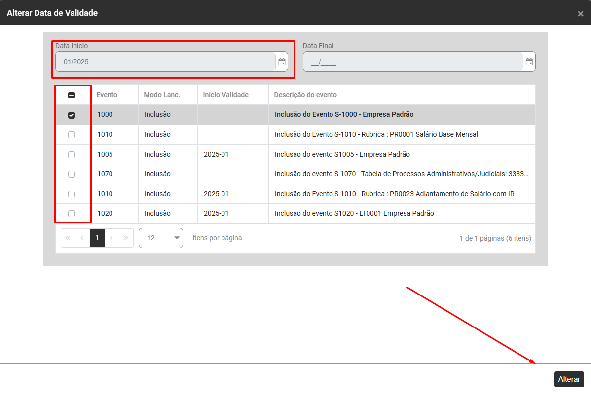 Defina a data correta para início da validade, defina o evento e clique em Alterar