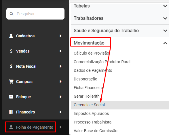 Após a conferência e correção das datas de obrigatoriedade, acesse Folha de Pagamento>Movimentação>Gerencia eSocial