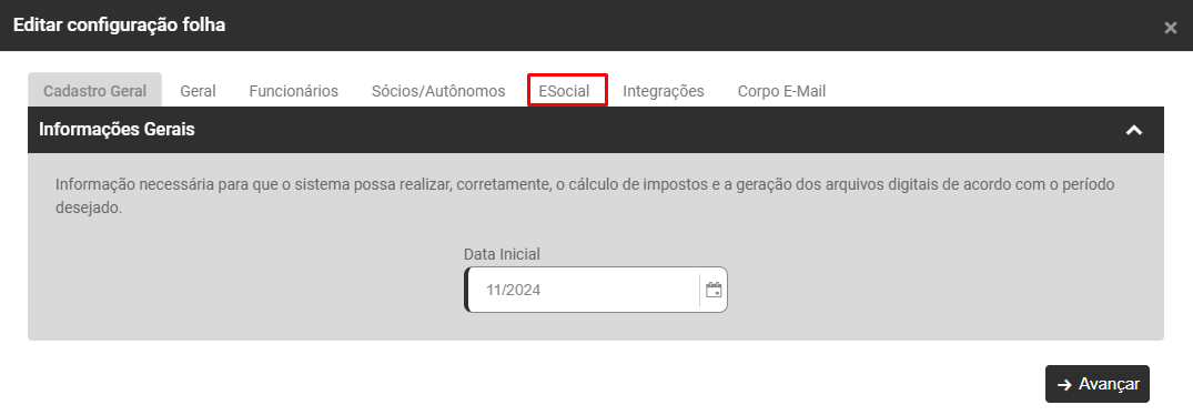 Edite a Empresa que apresentou a inconsistência e em seguida acesse a aba ESocial