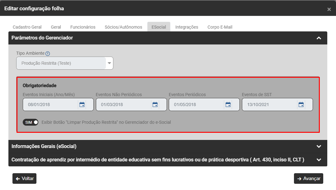 Faça a conferência das informações definidas no Campo Obrigatoriedade