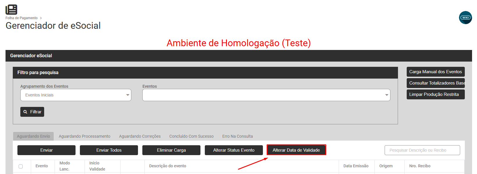 Caso a data do evento esteja errada e você precise corrigir, selecione a carga do evento e clique no botão Altera Data de Validade