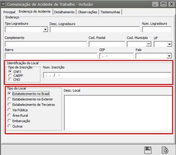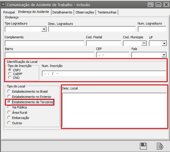 Funcionário alocado em um contratante ou Obra: O local de acidente deve ser informado que foi no Estabelecimento de Terceiros e o serviço vinculado a ele tem que ser o TOMADOR.
