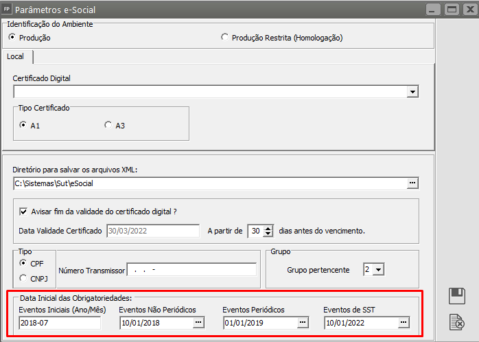 Ação Sugerida: Verificar datas do início das Obrigatoriedades estão preenchidas nos Parâmetros eSocial