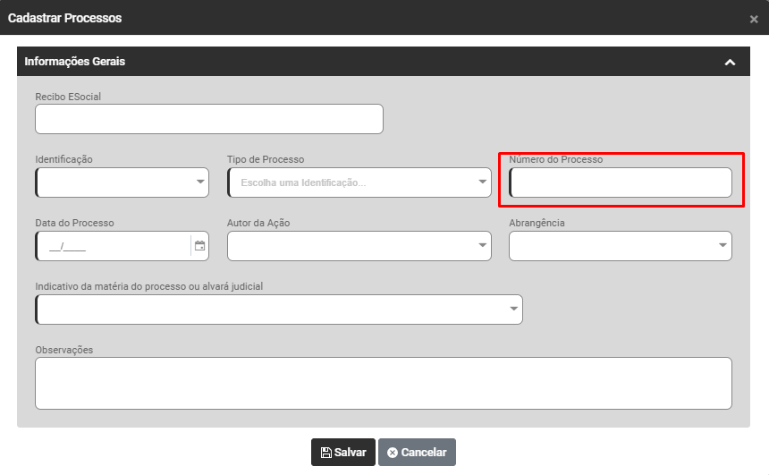 Ação Sugerida: Verifique se as informações do número do processo e tipo do processo estão corretas