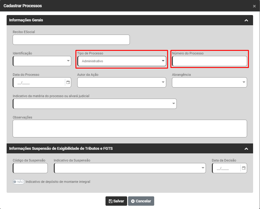 Ação Sugerida: Verifique se as informações do número do processo e tipo do processo estão corretas.