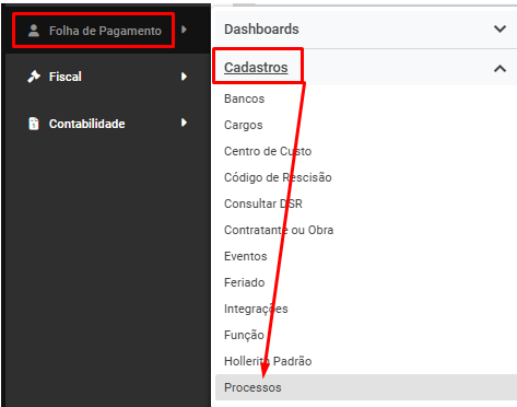Correção: Acesse o menu Folha de Pagamento>Cadastros>Processos