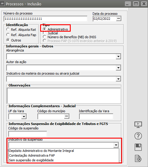 - Se Tipo de Processo = 1 - (Administrativo), o indicativo de suspensão deve ser igual a [03, 14, 90, 92].
