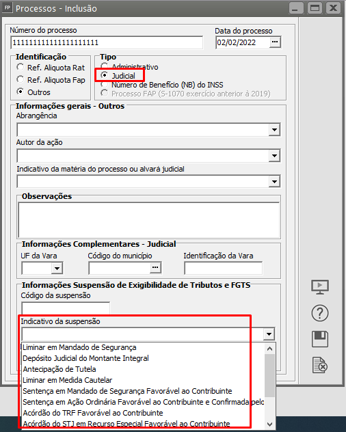 - Se Tipo de Processo = 2 - (Judicial), o indicativo de suspensão deve ser igual a [01, 02, 04, 05, 08, 09, 10, 11, 12, 13, 90, 92].