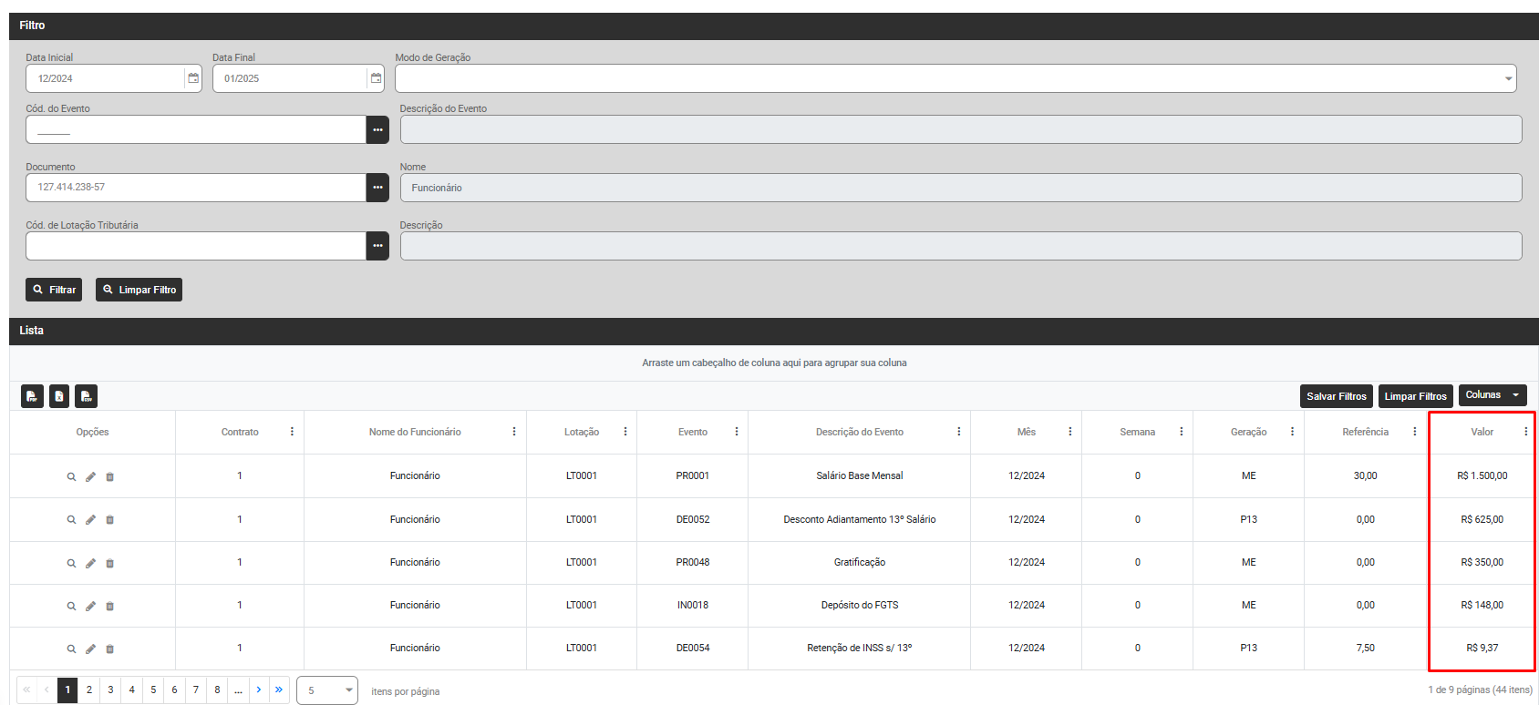 Correção: Acesse o menu Folha de Pagamento>Movimentação>Ficha Financeira