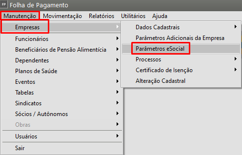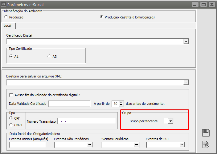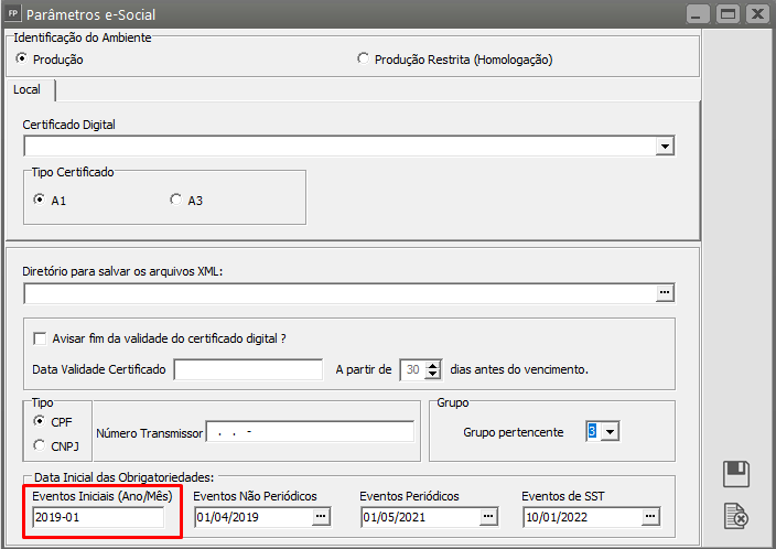 Exemplo: Empresas enquadradas no grupo 3 a obrigatoriedade é 01/2019. Porém, no momento do envio só deve ser utilizado essa data, se a empresa já existia antes dela. Caso a empresa tenha sido aberta em 07/2019, a data a ser utilizada no momento de envio é ‘2019-07’07’. O mesmo ocorre para grupo 1 e 2 e suas respectivas obrigatoriedades. Para saber a data de obrigatoriedade basta acessar o menu 'Manutenção>Empresas>Parâmetros eSocial':