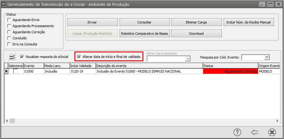 Envie novamente a carga do s1000 que está com o status 'Aguardando Correção', corrigindo a data do início da validade, lembre-se que a data final não deve ser preenchida.