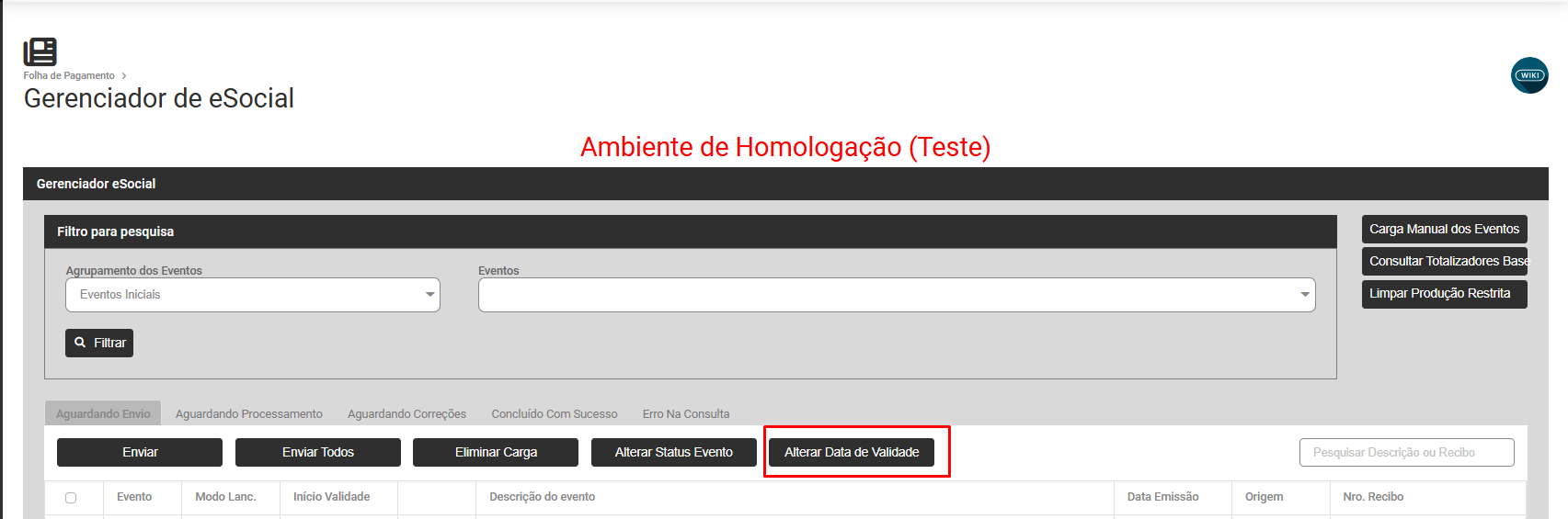Para gerar um evento para correção da data de término da validade do evento S1005 acesse o Folha de Pagamento>Movimentação>Gerencia eSocial e Selecione o evento S1005, em seguida acesse o botão Alterar Data de Validade