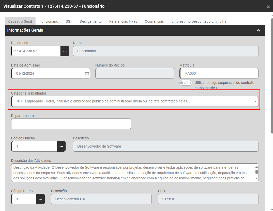 Descrição: "Não foi localizado o contrato de trabalho do trabalhador CPF: {0} e Categoria: {1}".