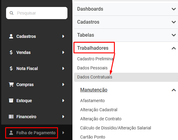 Correção: Acesse o menu Folha de Pagamento>Trabalhadores>Dados Contratuais