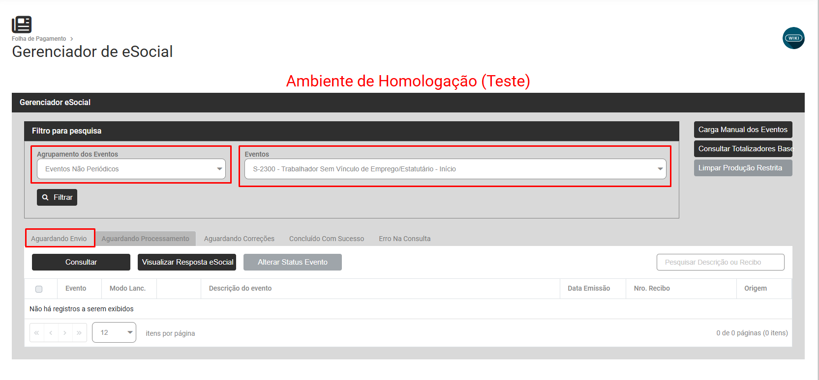 Filtre por Eventos Iniciais - S2300 (Trabalhador Sem Vínculo de Emprego/Estatutário - Inicio) - Aguardando Envio e faça o envio do mesmo para o Portal do eSocial