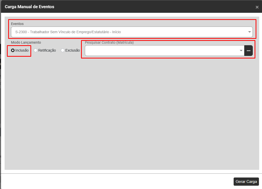 Defina Evento S2300 - Modo de Lançamento Inclusão e defina o Contrato (Matrícula) para a qual será gerada a Carga Manual
