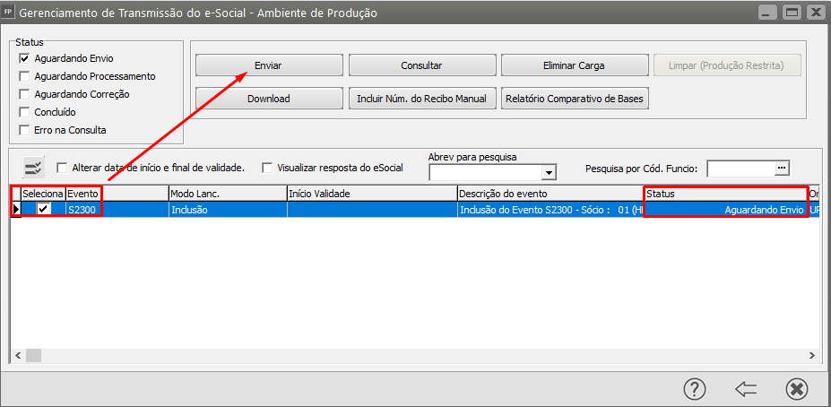 Verifique se a carga do evento está com Status Aguardando envio, em caso afirmativo façofazer o envio da mesma.