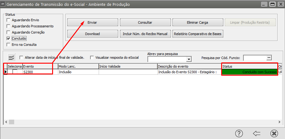 Correção: Acesse o Gerenciamento de Transmissão do eSocial,eSocial, filtre por Eventos Não Periódicos S2300 e clique na seta avança.