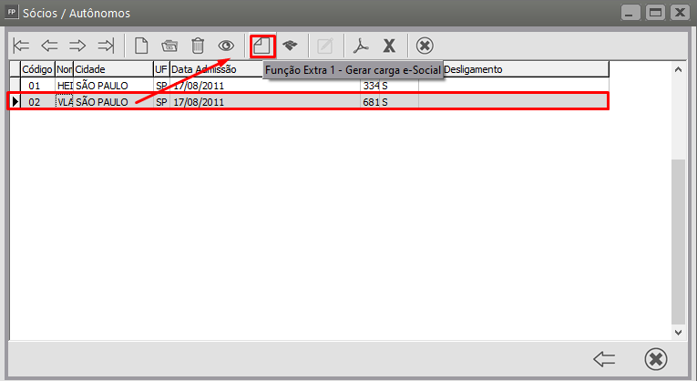 Será apresentadaapresentado a tela contendo todos os sócios e autonômos cadastrados, clique na linha do sócio e em seguida clique no botão Função Extra 1 - Gerar Carga e-Social.