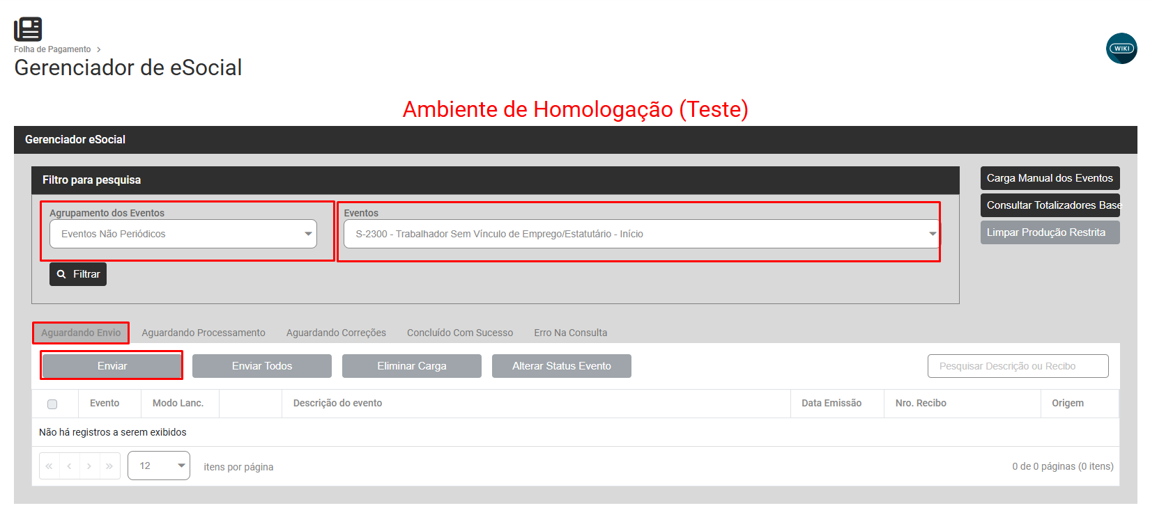 Filtre por Eventos Não Periódicos - S2300 - Aguardando Envio e realizar o envio do evento para o Portal do eSocial