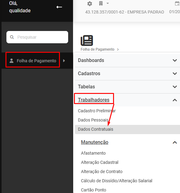 Correção: Acessar o menu Folha de Pagamento>Trabalhadores>Dados Contratuais