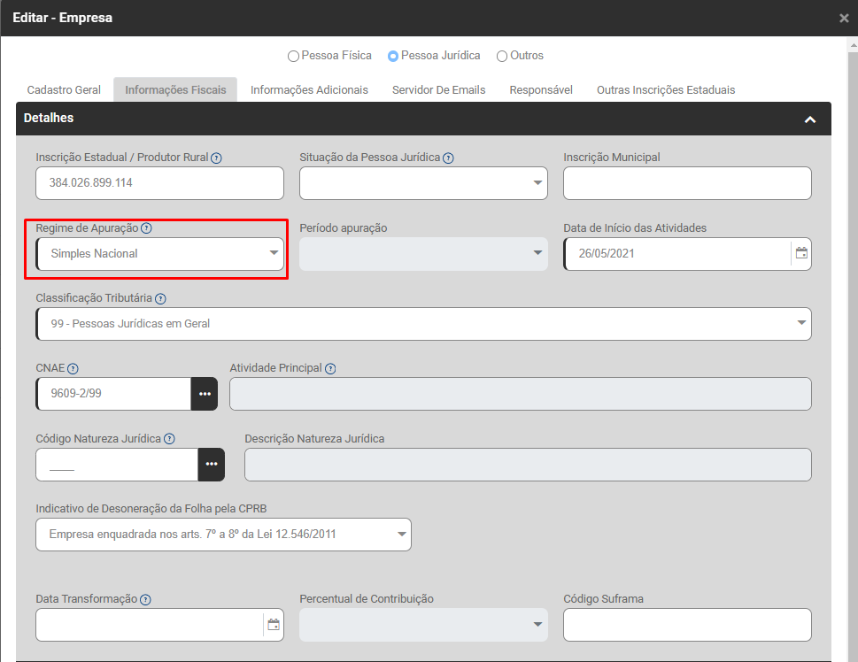 Em linhaseguida da empresa e fazer a edição do cadastro, acessaracesse a aba ParâmetrosInformações GeraisFiscais>Detalhes ,e verificarverifique se a Classificação Tributária é 03