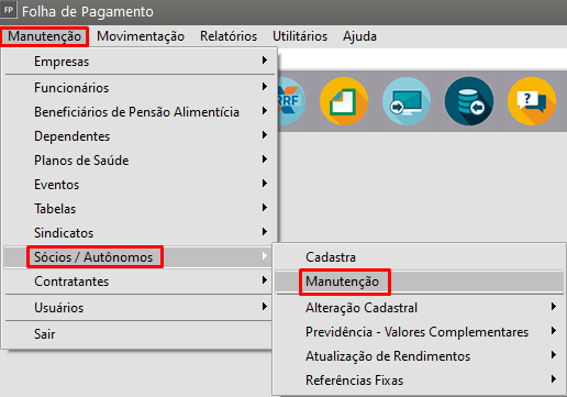Acesse o cadastro do sócio/autônomo em ‘Manutenção>Sócios/Autônomos>Manutenção’: