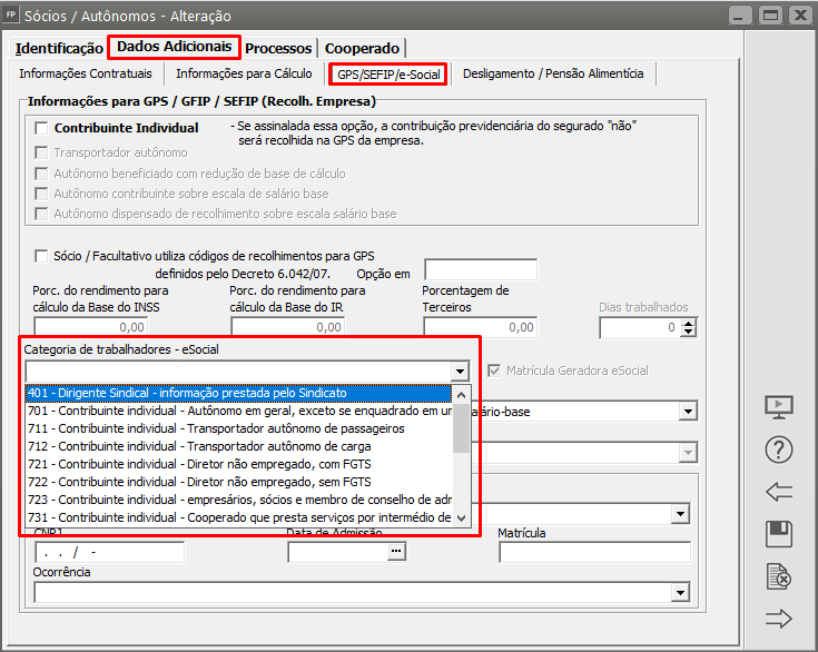 Acesse a aba ‘Dados Adicionais>GPS/SEFIP/eSocial’ e verifique se a categoria informada está correta: