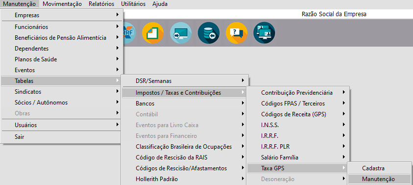 Correção: Acesse o menu Manutenção > Tabelas > Impostos Taxas e Contribuições > Taxa GPS > Manutenção, clique na seta Avança
