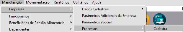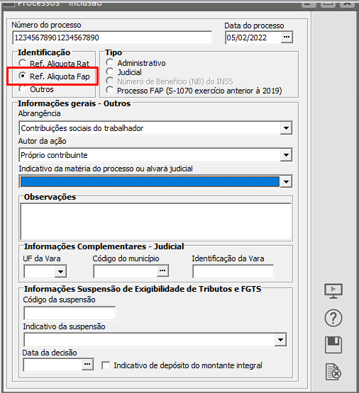 Caso a alíquota esteja correta devido a algum processo judicial que ampara o recolhimento com uma alíquota menor do que a estipulada pela legislação, será necessário acessar o menu Manutenção > Empresas > Processo e realizar o cadastro com as informações do Processo.