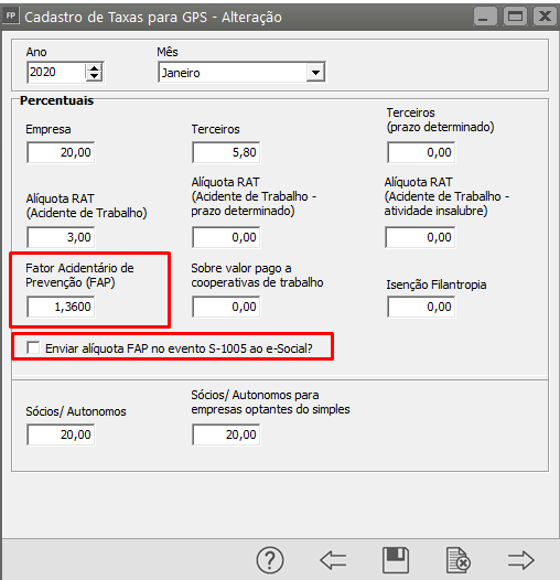 Confira a alíquota informa e selecione a opção Enviar alíquota FAP no evento S-1005 ao eSocial