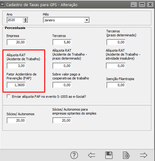 Edite a ultima tabela cadastrada e confira os campos correspondentes as alíquotas RAT e FAP