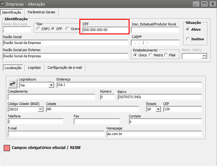 Edite o cadastro da Empresa e Confira o número informado no campo CPF