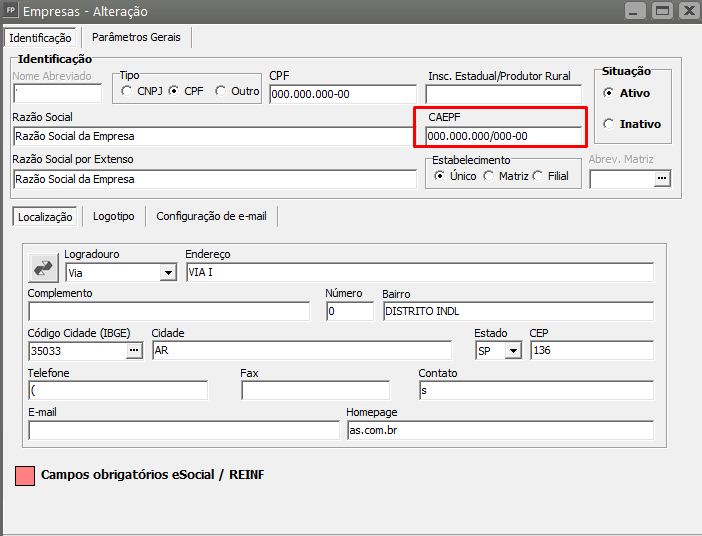Ação Sugerida: Conferência do número informado no campo  CAEPF da Empresa