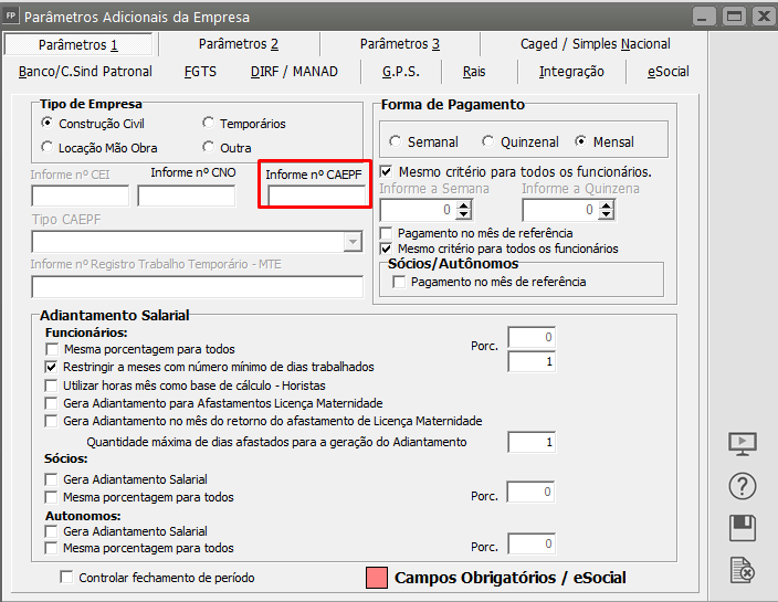 Em seguida acesse o menu Manutenção > Empresas > Parâmetros Adicionais da Empresa - aba Parâmetros 1 e confira o CAEPF informado