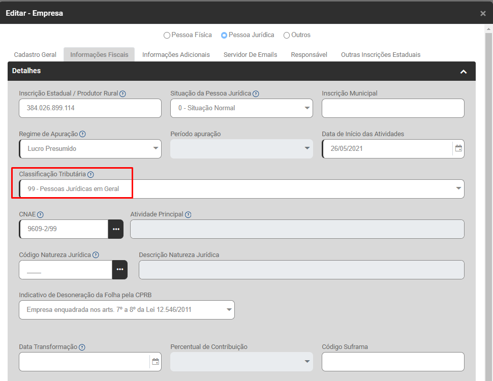Acesse a aba Informações Fiscais>Detalhes e faça a conferência da Classificação Tributária informada para a Empresa